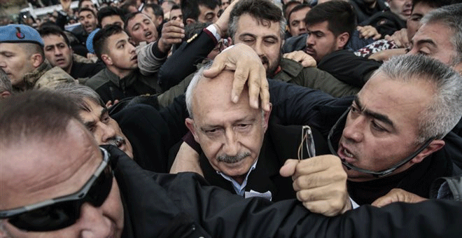 Ο Κιλιτσντάρογλου, 70 ετών, επικεφαλής του Ρεπουμπλικανικού Λαϊκού Κόμματος (CHP, σοσιαλδημοκρατικό) δέχθηκε χθες στην Άγκυρα επίθεση από το πλήθος στην κηδεία ενός στρατιώτη που είχε σκοτωθεί στις μάχες εναντίον Κούρδων ανταρτών στο νοτιοανατολικό τμήμα της χώρας. Φυγαδεύτηκε από τις δυνάμεις ασφαλείας σε ένα παρακείμενο σπίτι.
