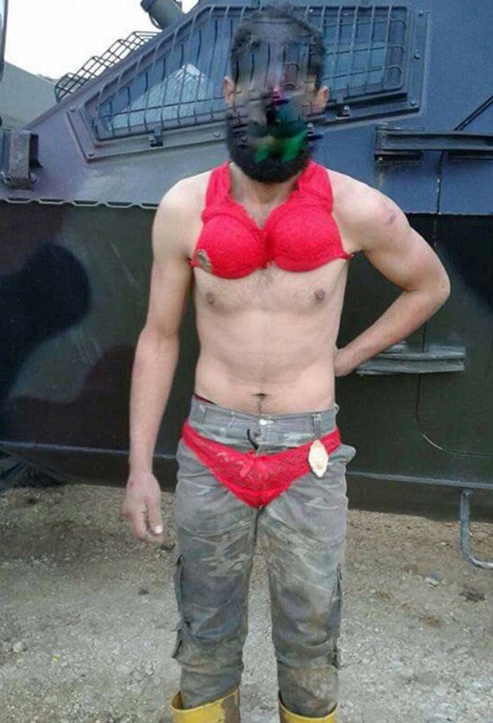 Στις φωτογραφίες οι πρόσφυγες εμφανίζονται να φορούν παντελόνια και γαλότσες, αλλά και κίτρινα, ροζ και κόκκινα γυναικεία εσώρουχα αντίστοιχα και να στέκονται δίπλα από ένα τανκ.