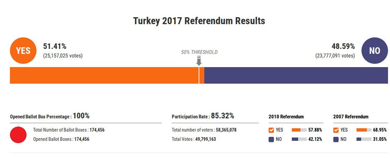 Συγκεκριμένα, υπέρ του «ναι» ψήφισαν 25.157.025 (ποσοστό 51,41%), ενώ την ίδια στιγμή υπέρ του «όχι» τάχθηκαν 23.777.091 πολίτες (ποσοστό 48,59%).