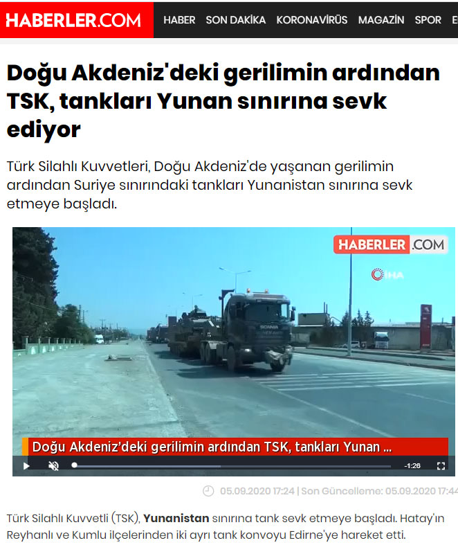 Σύμφωνα με τον ιστότοπο, ξεκίνησαν δύο αυτοκινητοπομπές με 40 τανκ από τα σύνορα της Συρίας, και συγκεκριμένα την Αλεξανδρέττα, με προορισμό τα σύνορα με την Ελλάδα στον Έβρο.