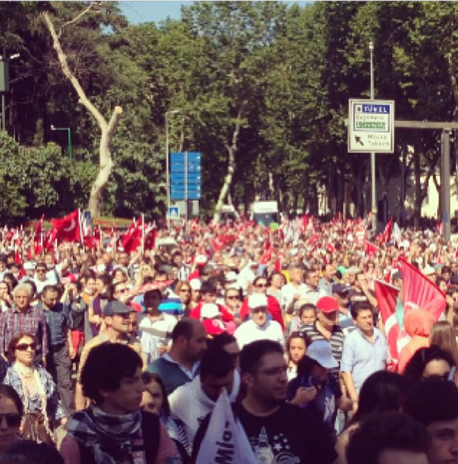 Παρά λοιπόν, τις απειλές που εκτόξευσε ο πρωθυπουργός της Τουρκίας ότι μπορεί να κινητοποιήσει ένα εκατομμύριο μέλη του κόμματος του, η αστυνομία απαγκιστρώθηκε από το κέντρο της Πόλης νωρίς το απόγευμα. Δεκάδες χιλιάδες διαδηλωτές γέμισαν στη συνέχεια την Πλατεία Ταξίμ και τις παράπλευρες οδικές αρτηρίες, το Πέραν, μέχρι και πάνω από την Πλατεία κοντά και πέρα από ξενοδοχείο Χίλτον.