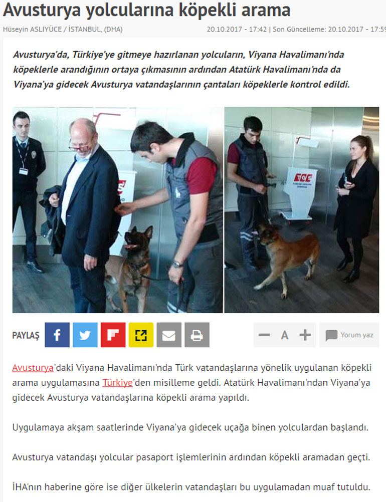 Από σήμερα λοιπόν, οι Aυστριακοί που αναμένουν στο αεροδρόμιο για να εισέλθουν σε αεροσκάφη για να ταξιδέψουν στην Αυστρία υπόκεινται σε έλεγχο από ειδικά εκπαιδευμένα, τουρκικά αυτή τη φορά σκυλιά. Το ζήτημα είναι ότι αυτή η είδηση δημοσιεύθηκε στο πρωτοσέλιδο της τουρκικής εφημερίδας Hurriyet.