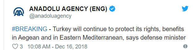 «Οι ενέργειες της Ελλάδας και της ”Ελληνικής Κύπρου” στην περιοχή για υδρογονάνθρακες συνιστούν απειλή και κίνδυνο για την Τουρκία» είχε πει στα τέλη Νοεμβρίου ο Ταγίπ Ερντογάν τονίζοντας ότι οι κινήσεις που στοχεύουν στο να περιορίσουν την τουρκική επιρροή στην περιοχή είναι μάταιες.