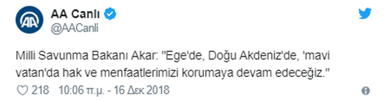 Ο πρώην αρχηγός των τουρκικών ενόπλων δυνάμεων έκανε, κατά την ίδια πηγή, έκανε και αναφορά στη «γαλάζια πατρίδα» το δόγμα δηλαδή της Άγκυρας λέγοντας ότι δεν θα αφήνει κανέναν να κάνει οτιδήποτε στη θάλασσα χωρίς προηγουμένως να ερωτηθεί και να συμφωνήσει η Τουρκία.