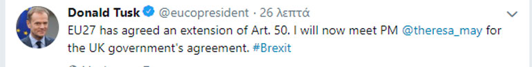 «Η Ε.Ε. των 27 και το Ηνωμένο Βασίλειο συμφώνησαν σε μια ευέλικτη παράταση (της διαδικασίας του Brexit) ως την 31η Οκτωβρίου. Αυτό σημαίνει ότι το Ηνωμένο Βασίλειο θα έχει έξι μήνες για να βρει την καλύτερη δυνατή λύση», ανέφερε ο Τουσκ σε δεύτερη ανάρτησή του στον προσωπικό του λογαριασμό στο Twitter.