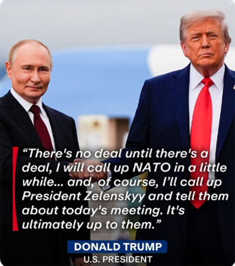 «Δεν υπάρχει συμφωνία μέχρι να υπάρξει συμφωνία. Θα τηλεφωνήσω στο ΝΑΤΟ σε λίγο και φυσικά θα τηλεφωνήσω στον πρόεδρο Ζελένσκι για να τους πω για τη σημερινή μας συνάντηση (σ.σ εννοεί με τον Πούτιν). Εξαρτάται τελικά απ’ αυτούς», έγραψε στην κοινή του φωτογραφία με τον Πούτιν.
