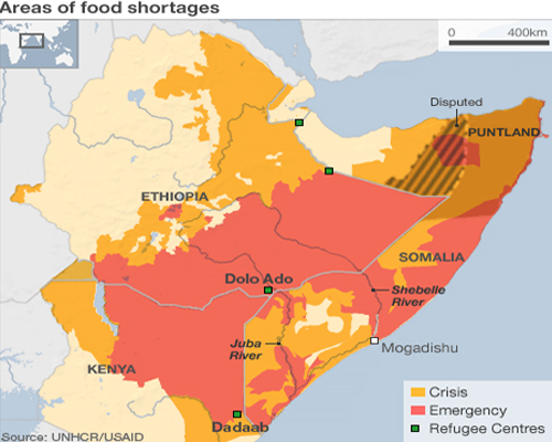 Στην κήρυξη τμημάτων της Σομαλίας σε κατάσταση επισιτιστικής κρίσης θα προχωρήσει ο Ο.Η.Ε. καθώς μεγάλο μέρος του πληθυσμού στα νότια της αφρικανικής χώρας βρίσκεται αντιμέτωπο με την πείνα, λόγω της εκτεταμένης περιόδου ξηρασίας που πλήττει την ευρύτερη περιοχή του Κέρας στην ανατολική Αφρική. Τα μεγαλύτερα προβλήματα εντοπίζονται στα σύνορα της χώρας με την Κένυα, με εκατοντάδες πρόσφυγες να περνούν καθημερινά στη γειτονική χώρα προκειμένου να εξασφαλίσουν την πρόσβασή τους σε νερό και τρόφιμα.
