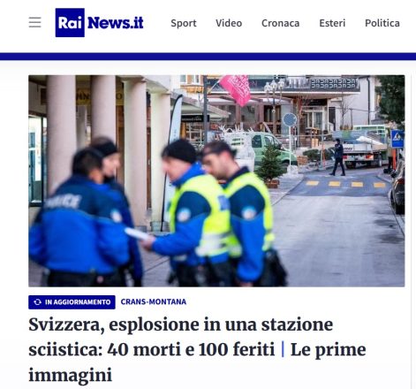 Ματωμένη Πρωτοχρονιά από έκρηξη που προκλήθηκε από πυρκαγιά τα ξημερώματα σε υπόγειο μπαρ στο Κραν Μοντανά, την πολυτελή αλπική πόλη, με το ομώνυμο χιονοδρομικό κέντρο, σκότωσε τουλάχιστον 40 ανθρώπους ενώ τραυμάτισε 100 άλλους, το πρωί της Πρωτοχρονιάς.