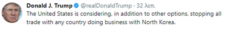 Ο Αμερικανός πρόεδρος έγραψε επίσης στο Twitter πως εξετάζει το ενδεχόμενο να διακόψει τις εμπορικές σχέσεις με οποιαδήποτε χώρα έχει συναλλαγές με τη Βόρεια Κορέα.