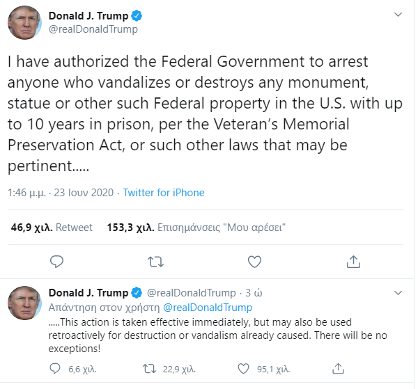 Ο Τραμπ, είχε νωρίτερα αναφέρει ότι οι διαδηλωτές που επιτέθηκαν σε άγαλμα του Άντριου Τζάκσον, που βρίσκεται απέναντι από τον Λευκό Οίκο στο Πάρκο Λαφαγιέτ, ενδέχεται να αντιμετωπίσουν ποινή φυλάκισης.
