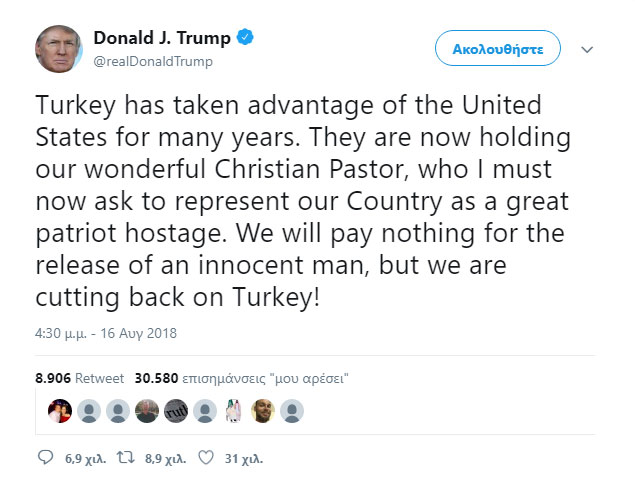 «Η Τουρκία για πολλά χρόνια εκμεταλλευόταν τις ΗΠΑ. Τώρα κρατάνε τον θαυμάσιο χριστιανό πάστορα, ο οποίος για τη χώρα μας είναι ένας σημαντικός πατριώτης όμηρος. Δεν θα πληρώσουμε τίποτα για την απελευθέρωση ενός αθώου, αλλά θα κάνουμε περικοπές στην Τουρκία» έγραψε στον λογαριασμό του στο Twitter.