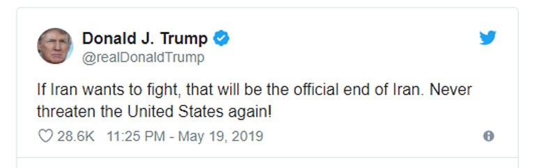«Εάν το Ιράν θέλει να πολεμήσει, αυτό θα είναι το επίσημο τέλος του» έγραψε χαρακτηριστικά ο πρόεδρος της Αμερικής.