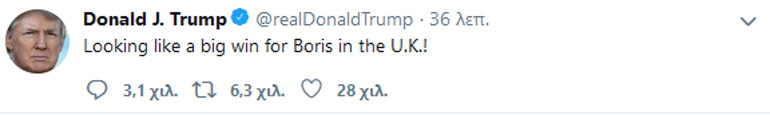 «Φαίνεται πως έχουμε μια μεγάλη νίκη για τον Μπόρις στο ΗΒ!», ανέφερε ο Ρεπουμπλικάνος πρόεδρος σε ανάρτησή του στο Twitter.