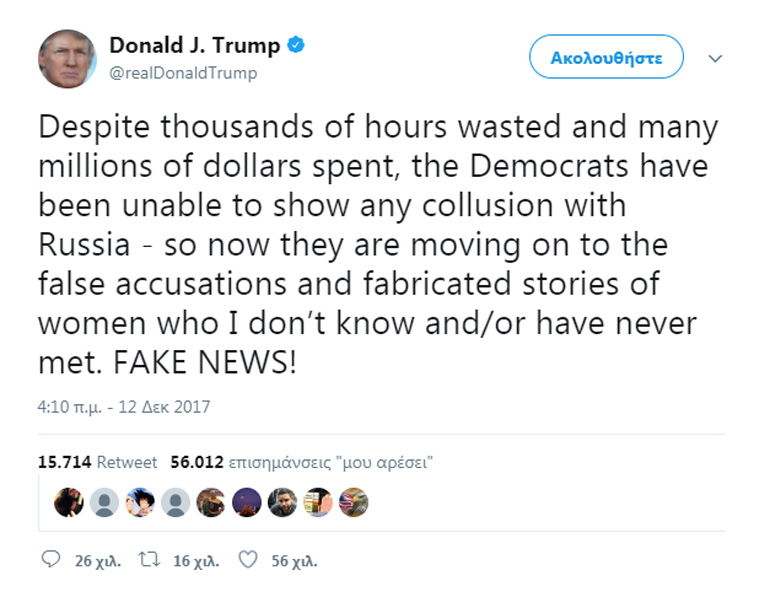 «Παρά τις χιλιάδες χαμένες ώρες και τα εκατομμύρια δολάρια που δαπανήθηκαν, οι Δημοκρατικοί αποδείχτηκαν ανίκανοι να αποδείξουν οποιαδήποτε σύμπραξη με τη Ρωσία», έγραψε ο ίδιος ο Τραμπ σε ένα μήνυμά του στο Twitter. «Έτσι προχωρούν σε ψευδείς κατηγορίες και κατασκευασμένες ιστορίες από γυναίκες που δεν τις γνωρίζω ή δεν τις συνάντησα ποτέ. ΨΕΥΔΕΙΣ ΕΙΔΗΣΕΙΣ!», συνέχισε.