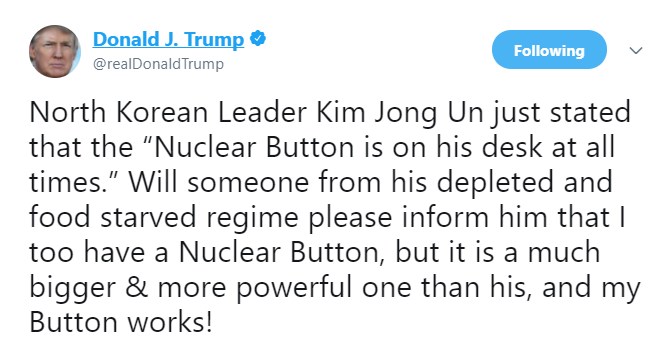 Ειδικότερα, ο Αμερικανός πρόεδρος ανέφερε μέσω Twitter ότι το δικό του «κουμπί», αυτό για την εκτόξευση των πυρηνικών όπλων των ΗΠΑ, «είναι πολύ μεγαλύτερο και πολύ δυνατότερο από το δικό του, και το δικό μου δουλεύει!».