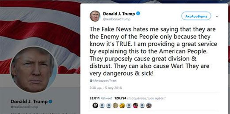 Ξεσπάθωσε και πάλι εναντίον των Μέσων ο πρόεδρος των ΗΠΑ, γράφοντας στο Τwitter του πως τα «άρρωστα και επικίνδυνα media με “fake news” του επιτίθενται χαρακτηρίζοντάς τον «εχθρό του λαού» και «με τα δημοσιεύματά τους μπορεί να προκαλέσουν πόλεμο»…