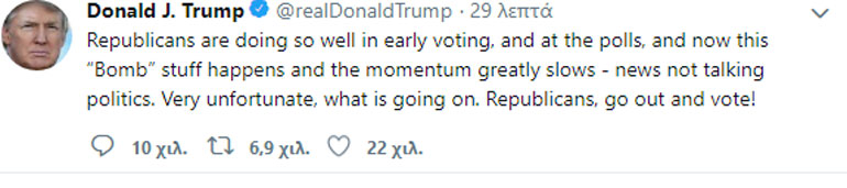 «Οι Ρεπουμπλικάνοι τα πηγαίνουν τόσο καλά στην πρόωρη εκλογική διαδικασία, αλλά και στις δημοσκοπήσεις και τώρα αυτά τα γεγονότα για τις “Βόμβες” συμβαίνουν και η δυναμική μειώνεται -ειδήσεις που δεν αναφέρονται στην πολιτική. Είναι πολύ ατυχές αυτό που συμβαίνει», έγραψε ο Τραμπ στο Twitter.