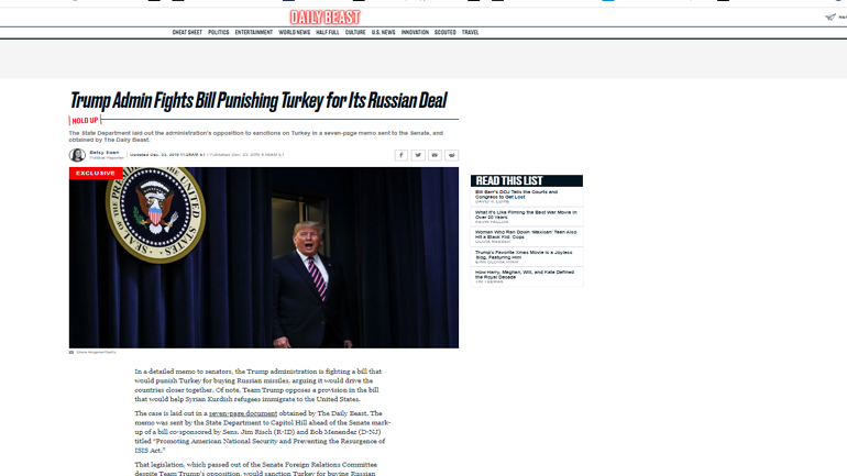 Στο έγγραφο που παρουσιάζει η ιστοσελίδα The Daily Beast, το Στέιτ Ντιπάρτμεντ υποστηρίζει ότι το νομοσχέδιο για τις αμερικανικές κυρώσεις θα φέρουν πιο κοντά την Άγκυρα και τη Μόσχα, ενώ επίσης αντιτάσσεται και σε μια διάταξη του νομοσχεδίου που θα βοηθούσε τους Κούρδους πρόσφυγες από τη Συρία να μεταναστεύσουν στις Ηνωμένες Πολιτείες.