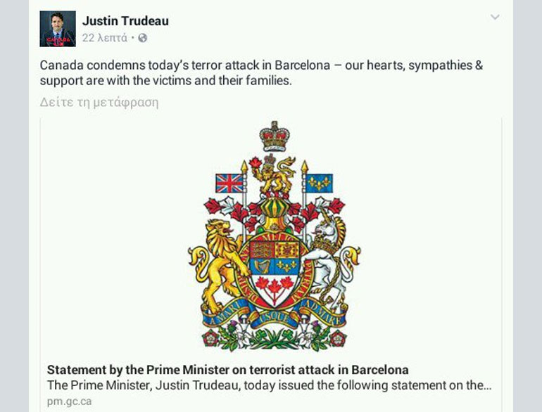 Μήνυμα καταδίκης της τρομοκρατικής επίθεσης στη Βαρκελώνη, έστειλε μέσω του προσωπικού λογαριασμού στο Facebook, o Καναδός Πρωθυπουργός, Τζαστίν Τριντό.