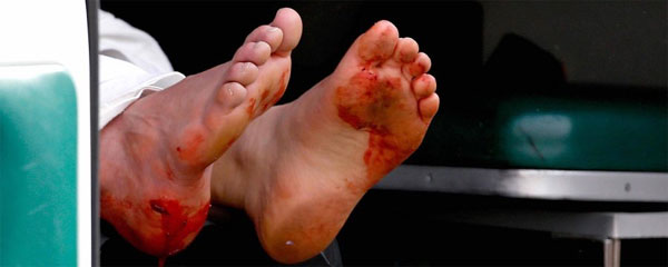 (Τραυματισμένοι αθλητές και θεατές πεσμένοι στο έδαφος)