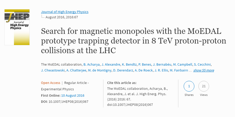 Η πρώτη επιστημονική δημοσίευση -με ελληνική συμμετοχή- του πειράματος MoEDAL που διεξάγεται στον Ευρωπαϊκό Οργανισμό Πυρηνικών Ερευνών (CERN) και αφορά την έρευνα των μαγνητικών μονοπόλων, αποτελεί ένα βήμα προόδου για την ανακάλυψη αυτού του, προς το παρόν, υποθετικού σωματιδίου που αφορά τον μαγνητισμό.