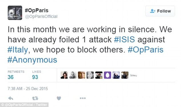 Μέσω ενός από τους λογαριασμούς που διατηρούν στο twitter, οι Anonymous ανακοίνωσαν ότι κατάφεραν να εμποδίσει επίθεση των τζιχαντιστών στην Ιταλία: «Αυτό τον μήνα εργαζόμαστε στη σιωπή. Έχουμε ήδη αποτρέψει μια επίθεση του ISIS στην Ιταλία. Ελπίζουμε να εμποδίσουμε και άλλες» αναφέρουν στην ανάρτηση.