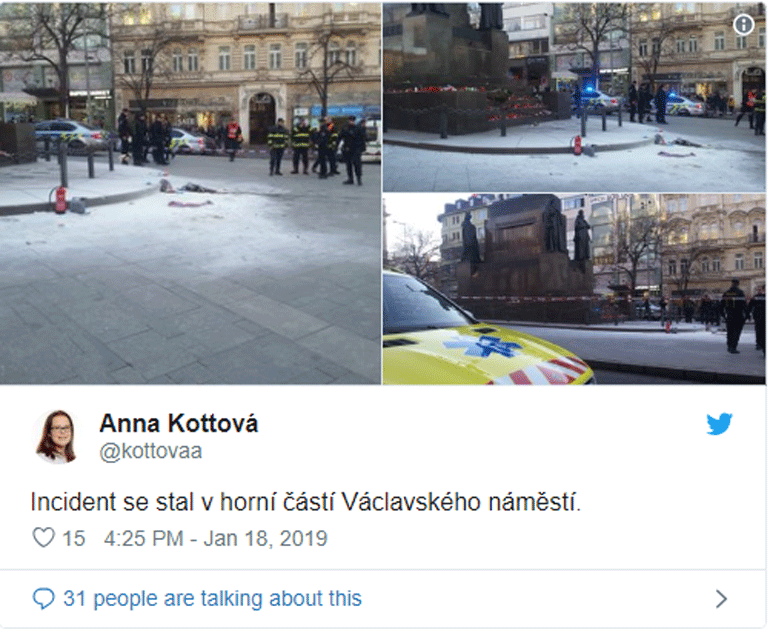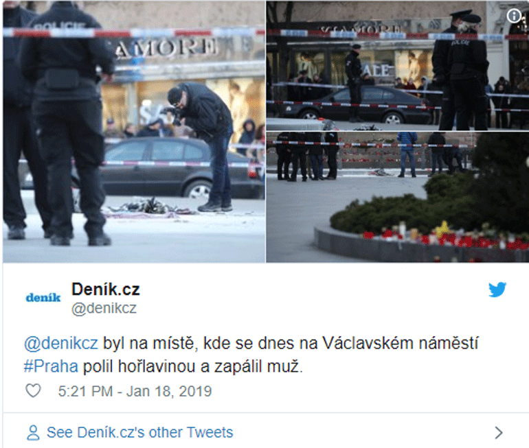 «Σύμφωνα με τις πρώτες πληροφορίες, ο άνδρας, γεννημένος το 1964, περιχύθηκε γύρω στις 15:00 (σ.σ.: τοπική ώρα, 16:00 ώρα Ελλάδας) με μια εύφλεκτη ουσία και έβαλε φωτιά», ανέφερε στο Twitter η αστυνομία της Πράγας.