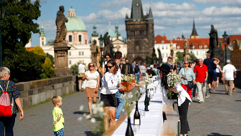 Χιλιάδες άνθρωποι κάθισαν χθες Τρίτη σε ένα τραπέζι μήκους 500 μέτρων στην γέφυρα του Καρόλου στην Πράγα για να γιορτάσουν την άρση των μέτρων που είχαν ληφθεί στην Τσεχία για τον περιορισμό της επιδημίας του κορωνοϊού.