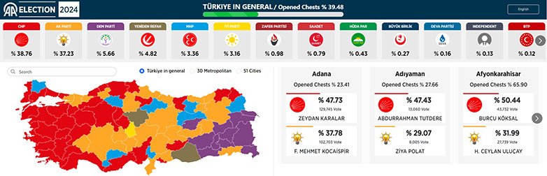 Στη Σμύρνη με 47,26% καταμετρημένο, ο Τσεμίλ Τουντσάι του CHP συγκεντρώνει 47,89%, έναντι 37,19% που συγκεντρώνει ο Χαμζά Μουντέν του ΑΚΡ.