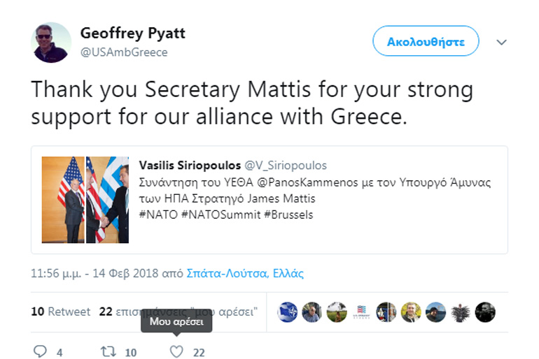 Με φόντο φωτογραφία από τη χθεσινή συνάντηση των υπουργών Άμυνας της Ελλάδας Πάνου Καμμένου και των ΗΠΑ Τζέιμς Μάτις, στο πλαίσιο της διήμερης συνεδρίασης των υπουργών Άμυνας του ΝΑΤΟ στις Βρυξέλλες, ο Αμερικανός πρέσβης Τζέφρι Πάιατ ανήρτησε στον προσωπικό του λογαριασμό στο Twitter: