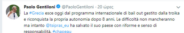 Στην έξοδο της Ελλάδας από τα μνημόνια αναφέρεται σε ανάρτησή του στο Twitter o Ιταλός πρώην πρωθυπουργός, Πάολο Τζεντιλόνι. Πιο αναλυτικά, ο κεντροαριστερός πρώην πρωθυπουργός της Ιταλίας τονίζει: