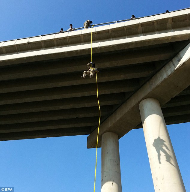 Φωτογραφίες που κυκλοφόρησαν από την ιρανική πόλη της Μοσούλης, αποτυπώνουν την προσπάθεια τζιχαντιστών να καταρριχηθούν από γέφυρα, στο πλαίσιο της στρατιωτικής τους εκπαίδευσης.