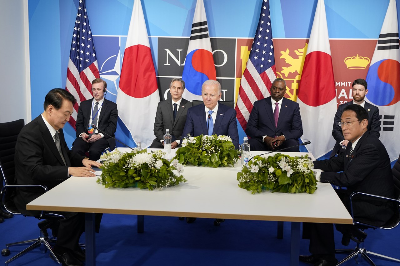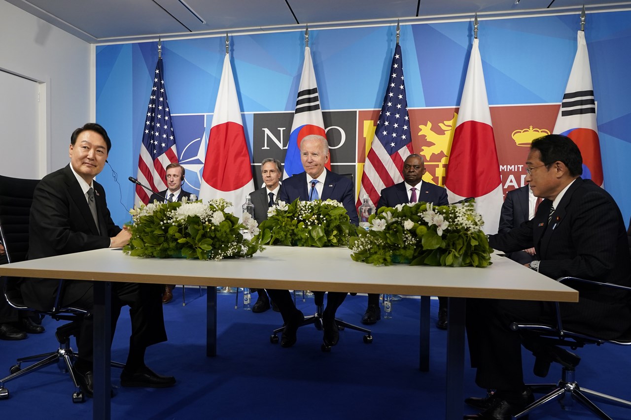 Ο Αμερικανός πρόεδρος, ο Νοτιοκορεάτης ομόλογός του Γιουν Σουκ-Γεόλ και ο πρωθυπουργός της Ιαπωνίας Φούμιο Κισίντα είχαν μια «ιστορική», όπως την χαρακτήρισαν, συνάντηση στο περιθώριο της συνόδου του ΝΑΤΟ στη Μαδρίτη.