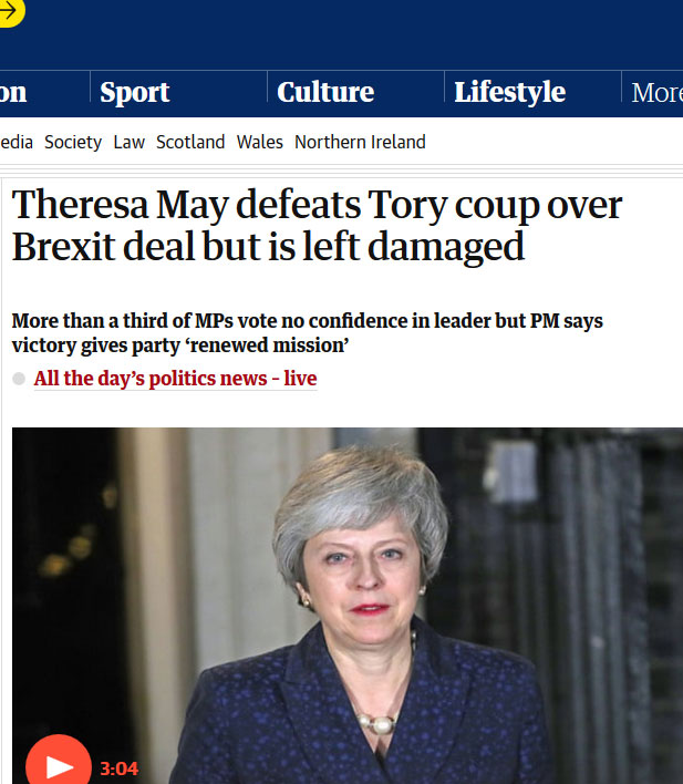 Η Τερέζα Μέι νίκησε το πραξικόπημα των Τόρις για τη συμφωνία του Brexit, αλλά μένει λαβωμένη, γράφει η «Guardian». Η Μέι εξασφάλισε την υποστήριξη του κόμματός της για την παραμονή της στην πρωθυπουργία- αλλά περισσότερο από το ένα τρίτο των συντηρητικών βουλευτών ψήφισε εναντίον της, προϊδεάζοντας για τη δύσκολη μάχη που έχει μπροστά της για να περάσει τη συμφωνία της για το Brexit από το κοινοβούλιο.