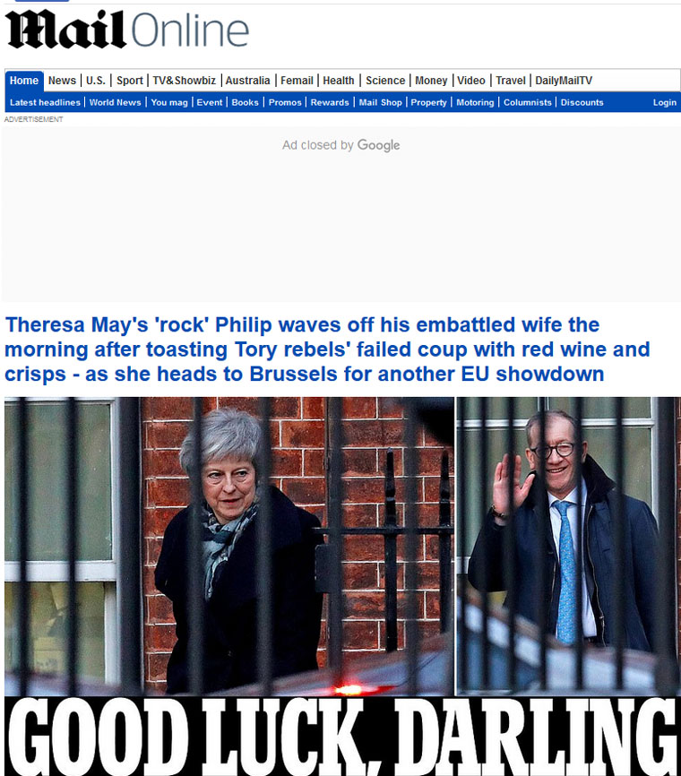 «Good Luck, Darling» είναι χαρακτηριστικά o κεντρικός τίτλος της ηλεκτρονικής έκδοσης της «Daily Mail» που συνοδεύει φωτογραφία της Βρετανίδας πρωθυπουργού να αναχωρεί για τις Βρυξέλλες με τον σύζυγό της να την αποχαιρετά κουνώντας το χέρι του, λίγες ώρες μετά την ψηφοφορία επί της πρότασης μομφής εναντίον της.