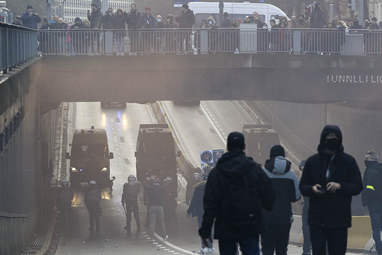 Σύμφωνα με το rtbf, το οποίο επικαλείται το δίκτυο VRT, μία ομάδα εκτόξευσε προς την πλευρά των αστυνομικών κροτίδες. Οι Αρχές απάντησαν με κανόνια νερού και δακρυγόνα.