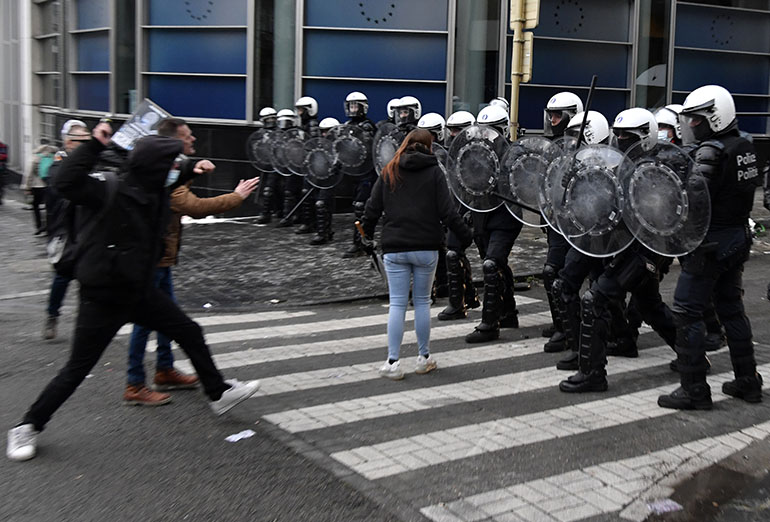Αστυνομικοί των μονάδων αντιμετώπισης ταραχών με ασπίδες και κράνη είχαν αναπτυχθεί περιμετρικά της ευρωπαϊκής συνοικίας, όπου στεγάζονται οι θεσμοί της ΕΕ. Πολλοί δρόμοι είχαν αποκλειστεί.