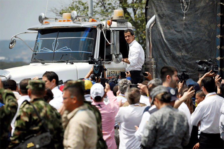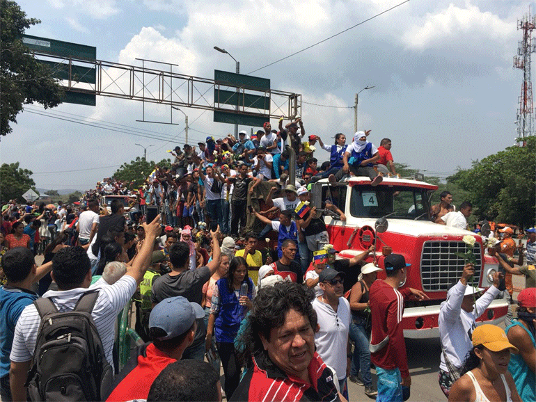 Τέσσερα φορτηγά που μεταφέρουν ανθρωπιστική βοήθεια και στα οποία έχουν σκαρφαλώσει δεκάδες εθελοντές, προσπαθούν να διασχίσουν τα σύνορα από την Κολομβία προς την Βενεζουέλα, σύμφωνα με τις εικόνες που μεταδόθηκαν απευθείας από την τηλεόραση της Βενεζουέλας.