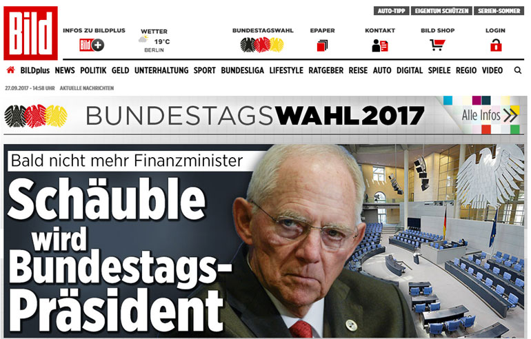 Όπως αναφέρεται σε δημοσίευμα της γερμανικής εφημερίδας Bild, οι επικεφαλής των Κοινοβουλευτικών Ομάδων Φόλκερ Κάουντερ και Αλεξάντερ Ντόμπριντ σκοπεύουν στην ολομέλεια της 17ης Οκτωβρίου να προτείνουν τον κ. Σόιμπλε για τη θέση του Προέδρου της Bundestag.