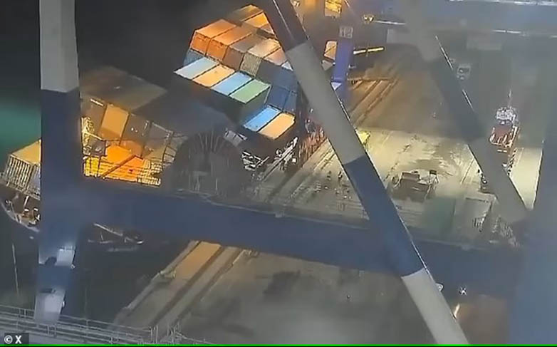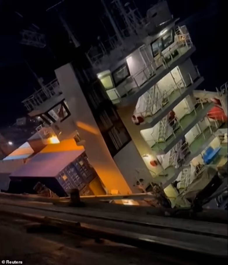 Τα πλάνα από το ασυνήθιστο περιστατικό δείχνουν το φορτηγό πλοίο να γέρνει και να αναποδογυρίζει, ενώ τα τεράστια κοντέινερ με τα οποία ήταν φορτωμένο, έπεφταν στη θάλασσα.