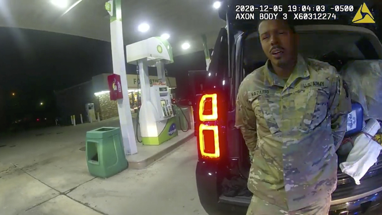 Ο Ναζάριο σταμάτησε σε ένα κοντινό βενζινάδικο, λιγότερο από δύο λεπτά αφού του έγινε σήμανση να σταματήσει. Κατά τη διάρκεια του ελέγχου, που καταγράφηκε από κάμερες στις στολές των αστυνομικών και το κινητό τηλέφωνο του Ναζάριο, ο υπολοχαγός είπε στους αστυνομικούς ότι φοβάται να βγει από το αυτοκίνητό του. Ένας αστυνομικός του απάντησε. «Ναι, καλά κάνεις και φοβάσαι», τονίζει η αγωγή.