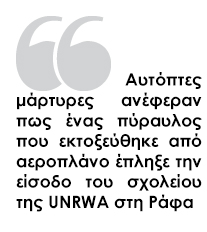 Αυτόπτες μάρτυρες και ιατρικές πηγές ανέφεραν πως ένας πύραυλος που εκτοξεύθηκε από αεροπλάνο έπληξε την είσοδο του σχολείου της UNRWA στη Ράφα, στο οποίο είχαν αναζητήσει καταφύγιο εκατοντάδες Παλαιστίνιοι από την περιοχή.
