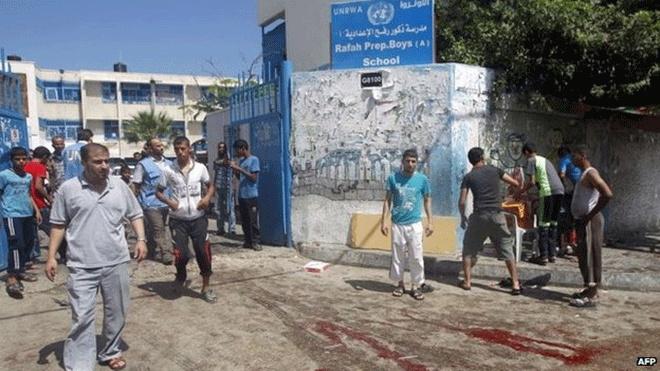 Τέλος δεν έχει το αιματοκύλισμα στη Λωρίδα της Γάζας. Σήμερα, σε νέο βομβαρδισμό του ισραηλινού στρατού εναντίον σχολείου του ΟΗΕ, τουλάχιστον 10 Παλαιστίνιοι σκοτώθηκαν και περίπου 30 τραυματίστηκαν.