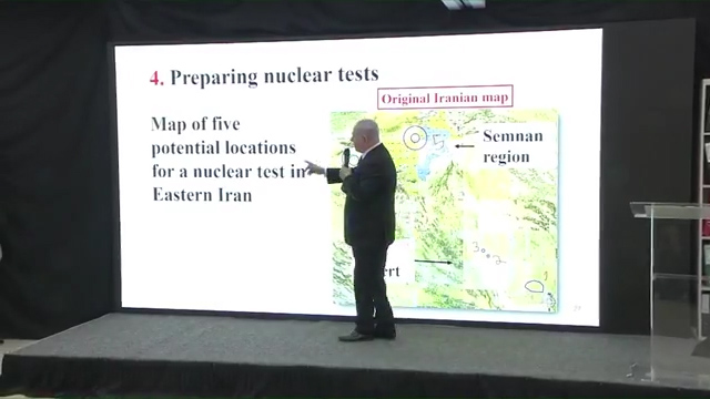 Ο επικεφαλής της ισραηλινής κυβέρνησης μίλησε στην αγγλική γλώσσα και παρουσίασε φωτογραφίες και βίντεο που ισχυρίστηκε ότι δείχνουν τις μυστικές πυρηνικές εγκαταστάσεις του Ιράν, όπως επίσης και ιρανικά έγγραφα και σχέδια για τη δημιουργία ατομικών όπλων.