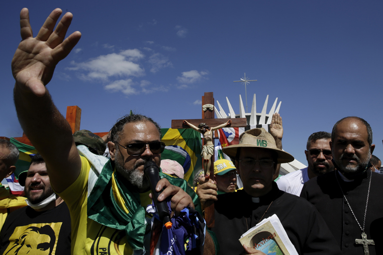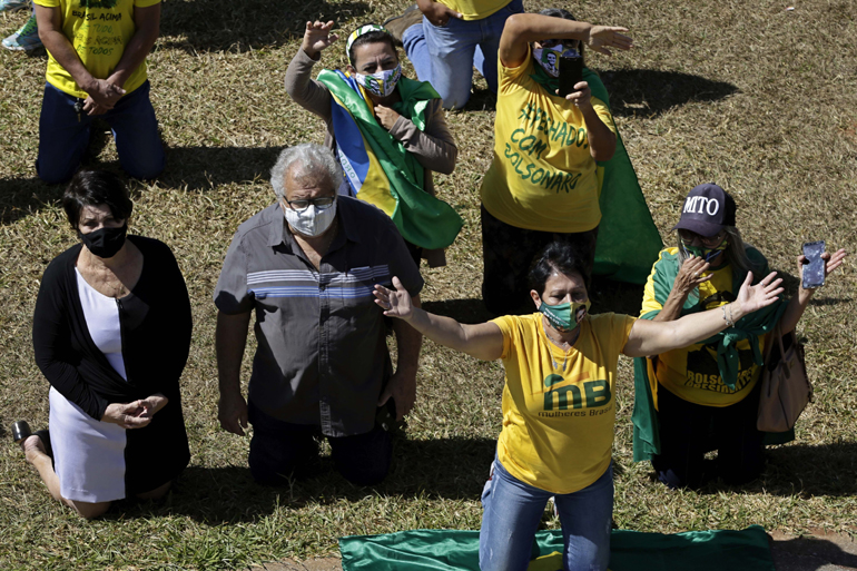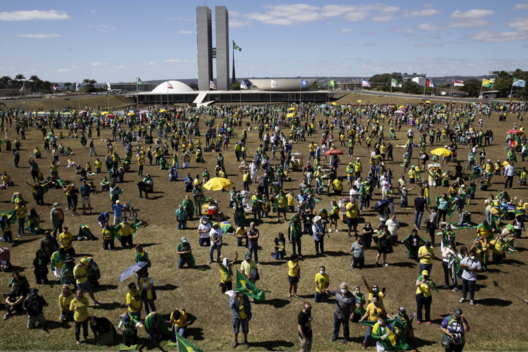 Ντυμένοι με τα χρώματα της σημαίας της Βραζιλίας, οι συμμετέχοντες διαδήλωσαν στο κέντρο της πρωτεύουσας, κρατώντας πατριωτικά σύμβολα, σταυρούς και φωτογραφίες του προέδρου, που παραμένει σε καραντίνα στο μέγαρο Alvorada στην Μπραζίλια, απ’ όπου ασκεί τα καθήκοντά του μέσω τηλεδιάσκεψης.