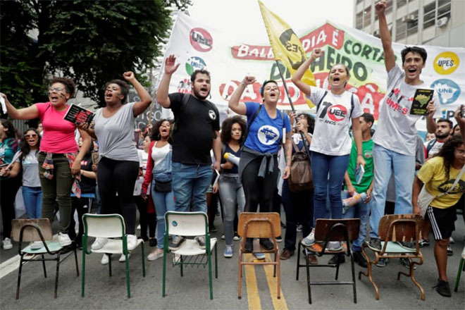 Μια θάλασσα διαδηλωτών πλημμύρισε το βράδυ της Τετάρτης τις μεγαλύτερες πόλεις της Βραζιλίας, όπου εκατοντάδες χιλιάδες άνθρωποι, εκπαιδευτικοί και σπουδαστές, βγήκαν στους δρόμους για να υπερασπιστούν τα πανεπιστήμια, τα οποία απειλούνται από τις μεγάλες δημοσιονομικές περικοπές.