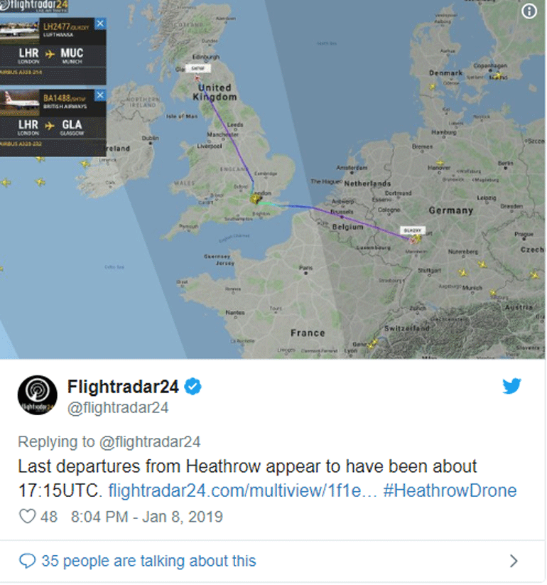 Λίγο νωρίτερα, ο υπουργός Μεταφορών Κρις Γκρέιλινγκ είχε ανακοινώσει μέσω του Twitter ότι ο στρατός ετοιμάζεται να αναπτύξει στο Χίθροου τον ίδιο εξοπλισμό που είχε τοποθετήσει και στο Γκάτγουικ πριν από τα Χριστούγεννα, εφόσον κάτι τέτοιο θεωρηθεί αναγκαίο.