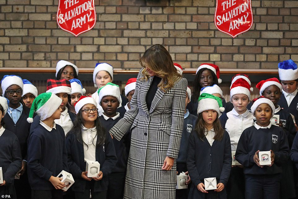 Η Μελάνια, που συνοδεύει στο Λονδίνο τον πρόεδρο των ΗΠΑ Ντόναλντ Τραμπ για τη σύνοδο του ΝΑΤΟ, έκανε φιλοφρονήσεις στους μαθητές για τα χριστουγεννιάτικα σκουφάκια που φορούσαν, ενώ τους βοηθούσε να φτιάξουν γιορτινά στεφάνια, την ώρα που μια μπάντα έπαιζε τα κάλαντα.