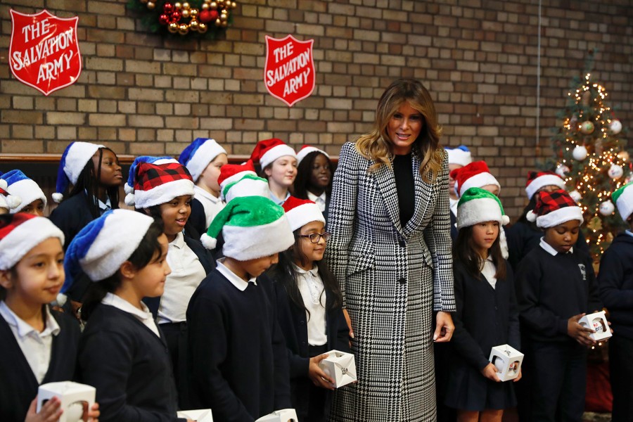 Δεκάδες μαθητές και μαθήτριες υποδέχθηκαν την Τετάρτη την Πρώτη Κυρία των ΗΠΑ Μελάνια Τραμπ στο βορειοανατολικό Λονδίνο, όπου παραβρέθηκε σε μια εκδήλωση του Στρατού της Σωτηρίας προκειμένου να μοιράσει χριστουγεννιάτικα δώρα και να στολίσει το χριστουγεννιάτικο δέντρο.