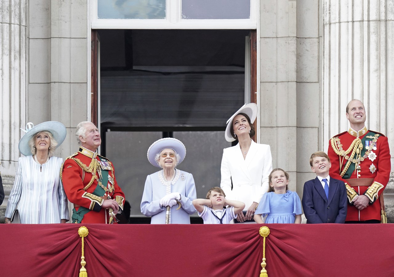 Η βασίλισσα επρόκειτο να εμφανιστεί και πάλι στον εξώστη λίγο αργότερα για μια υπερπτήση αεροπλάνων της Βασιλικής Πολεμικής Αεροπορίας, της RAF, αυτή τη φορά συνοδευόμενη από τα μέλη της βασιλικής οικογένειας που έχουν επίσημα καθήκοντα και από τα παιδιά τους.
